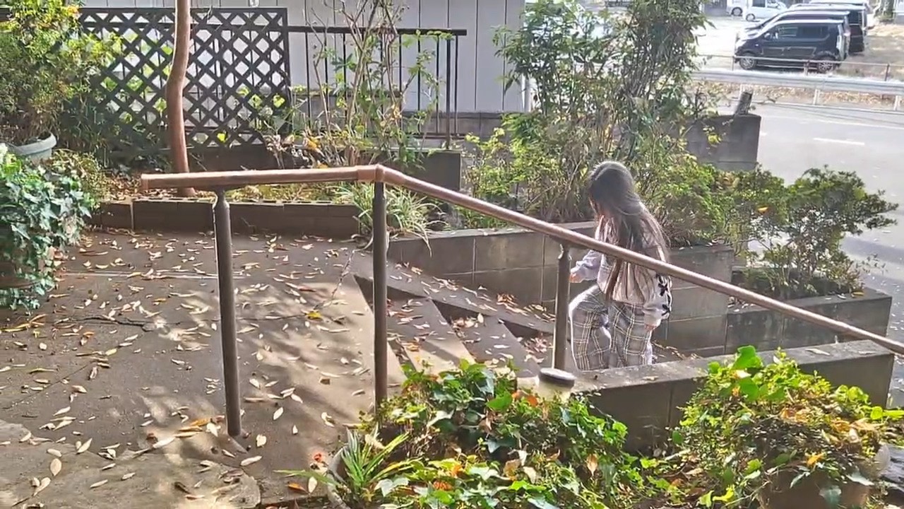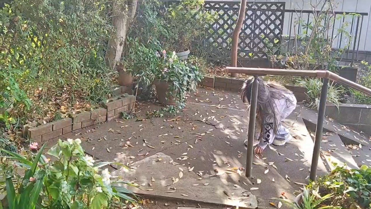 頭にポツン!! シイの実を拾う